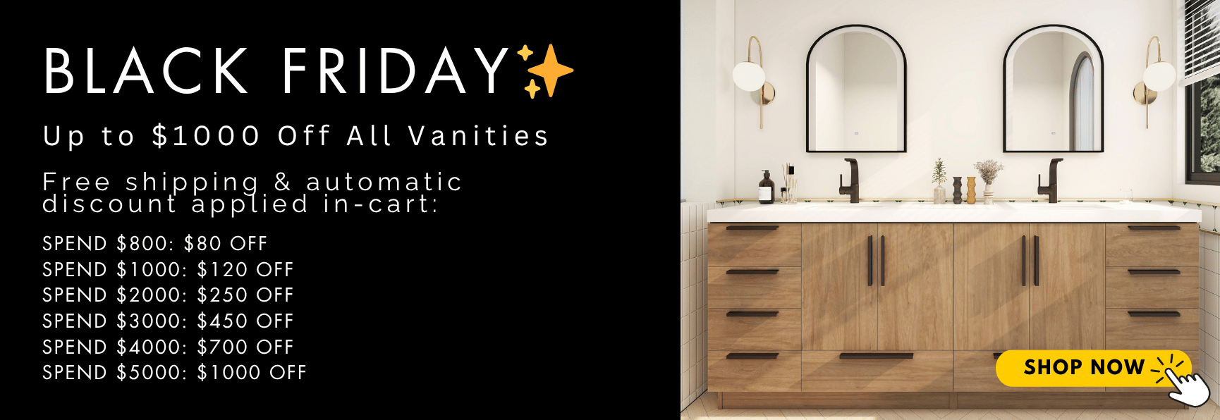Moreno Bath Black Friday 2025 Sale Offer: Up to an additional $1000 OFF All Vanities & Items with Free Shipping Included. No tax for out of CA orders. This storewide discount automatically applies to all items - just add your items to your cart or checkout and you will see the discount automatically applied based on your total order value.